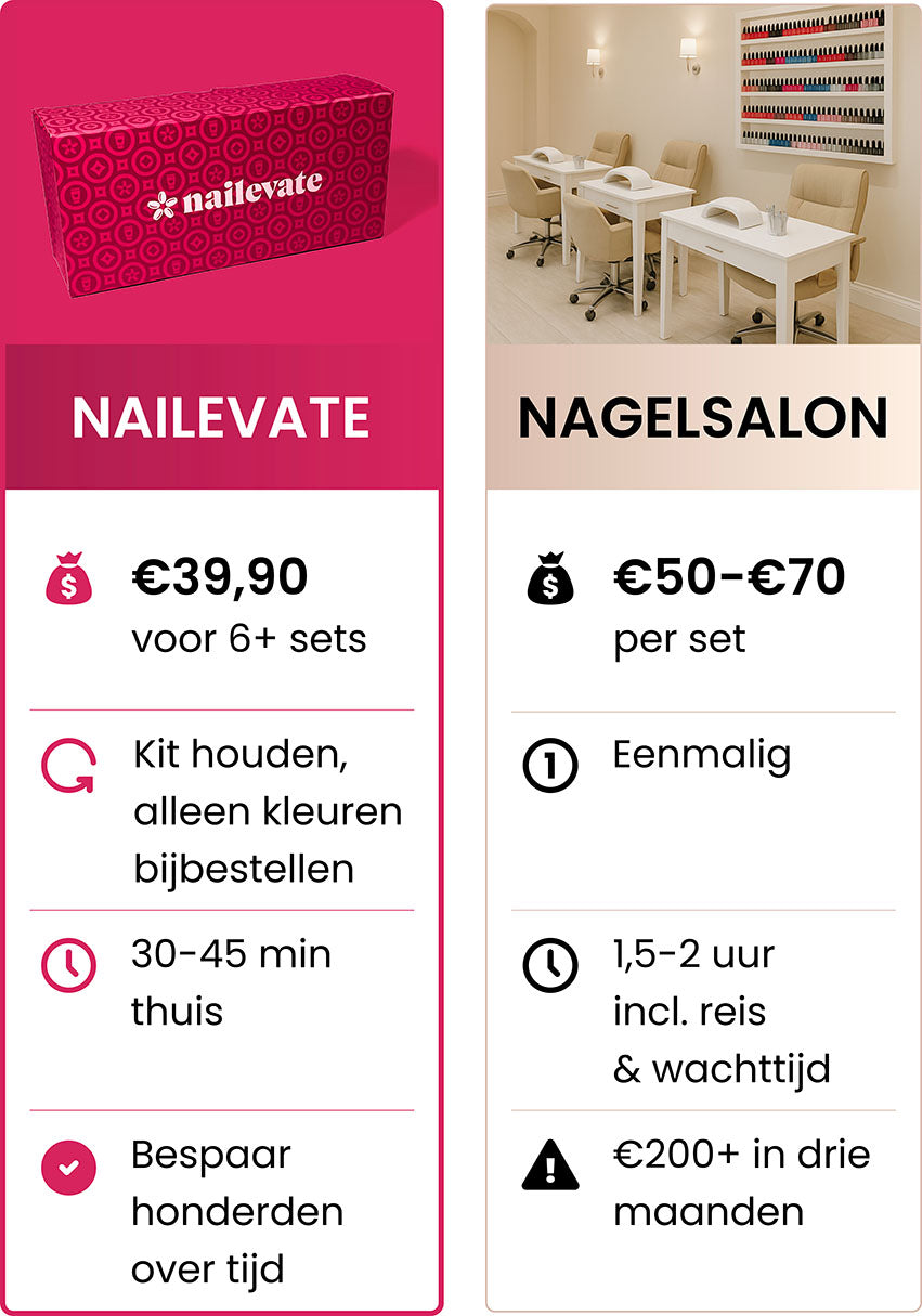 Sla het salon over. Bespaar geld. Ontdek waarom steeds meer mensen voor Nailevate kiezen voor nagels die opvallen. Klaar om de switch te maken?